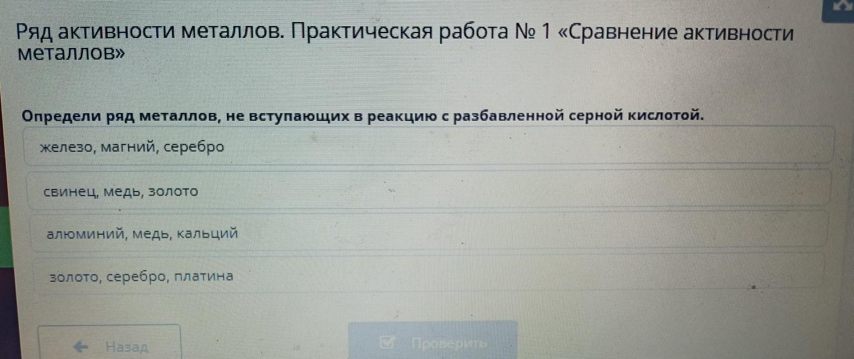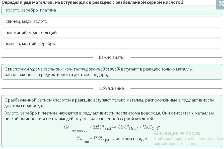 Определи ряд металлов, не вступающих в реакцию с разбавленной серной кислотой. железо, магний, серебро Свинец, медь, золото алюминий, медь, кальций золото, серебро, платина