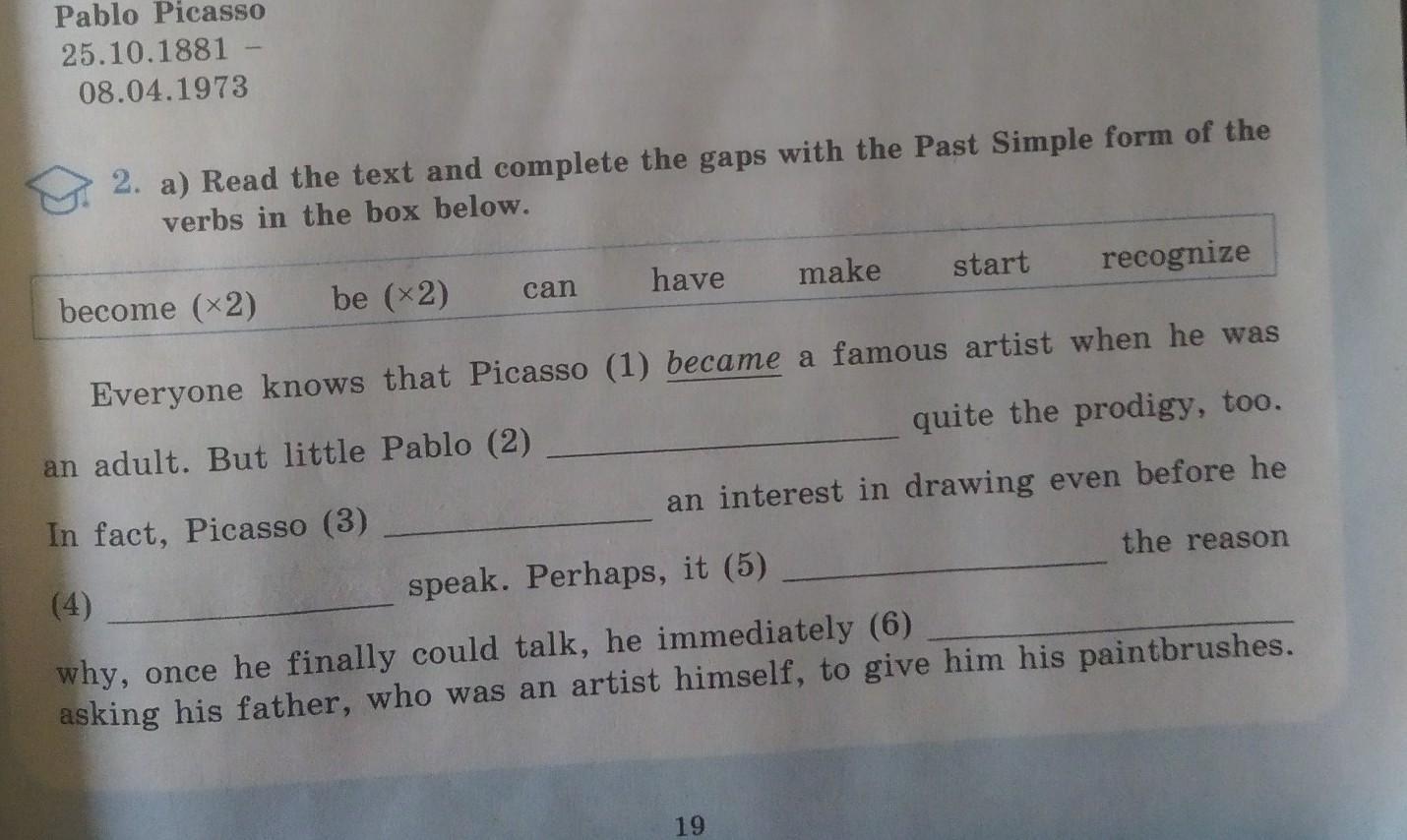 2. a) Read the text and complete the gaps with the Past Simple form of the verbs in the box below. become (x2) be (x2) can have make start recognize Everyone knows that Picasso (1) became a famous artist when he was an adult. But little Pablo (2) _____quite the prodigy, too. In fact, Picasso (3)____ an interest in drawing even before he (4)____ speak. Perhaps, it (5)____ the reason why, once he finally could talk, he immediately (6)____asking his father, who was an artist himself, to give him his paintbrushes. When Picasso (7)____ old enough to go to school, he said that he would only go there if he draw as much as he liked. Fortunately, the headmaster and the other students (8)_____ Picasso's gift, and more or less let him work as he wanted. Picasso (9)_____ a lot of contributions to modern art, including cubism, "Guernica," and people drawn with two eyes on one side of their face. The whole list of his contributions would be too exhaustive to read here. By the time of his death, he'd created over 22,000 works of art.