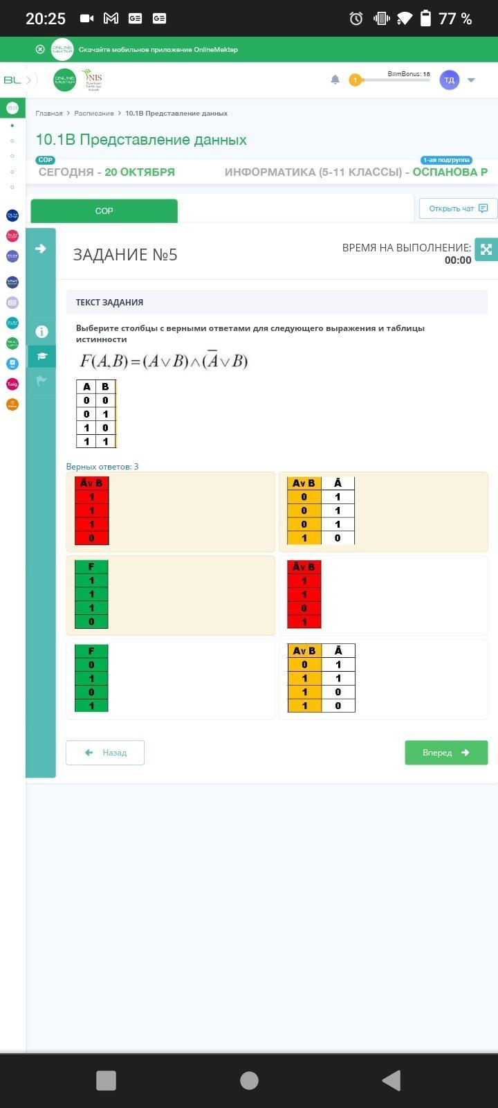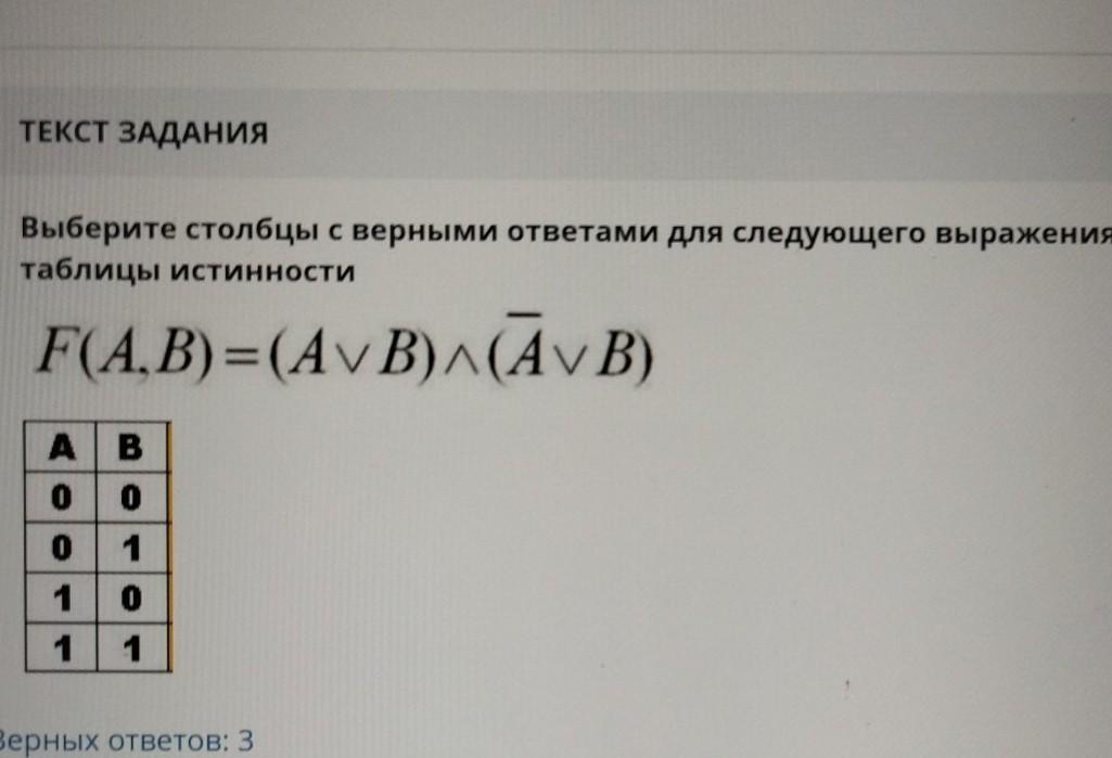 Выберите столбцы с верными ответами для следующего выражения и таблицы истинности F(А.В) =(AvB) ^(AvB)