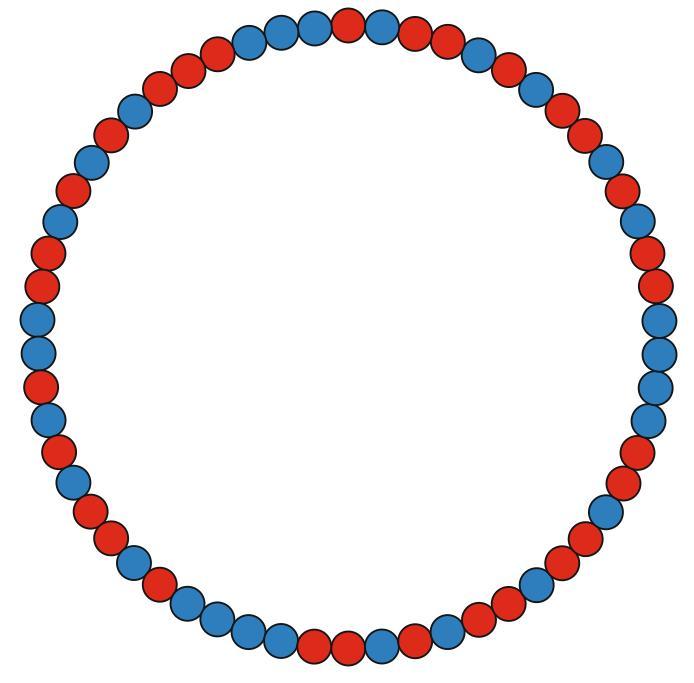В круг выложили 70 шаров двух цветов — красного и синего. Известно, что троек подряд стоящих шаров, среди которых больше красных, столько же, сколько и троек с большинством синих.