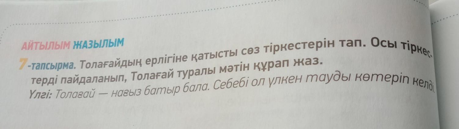АЙТЫЛЫМ ЖАЗЫЛЫМ -тапсырма. Толағайдың ерлігіне қатысты сөз терді пайдаланып, Толағай туралы мәтін құрап жаз. Үлгі: Толағай — нағыз батыр бала. Себебі ол үлкен тауды көтеріп келді ПОМОГИТЕ СРОЧНО