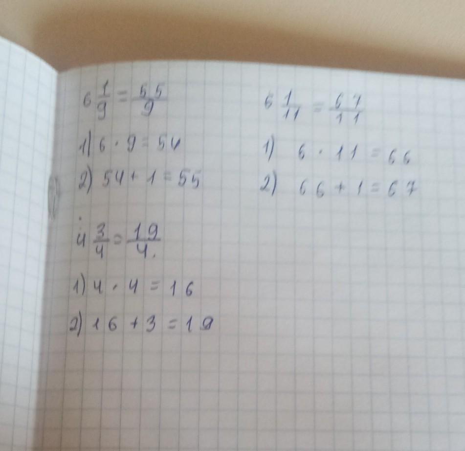 Запиши смешанные числа в виде неправильных дробей. (6)1/9=?/? (6)1/11=?/? (4)3/4=?/? числа в скобках это целое