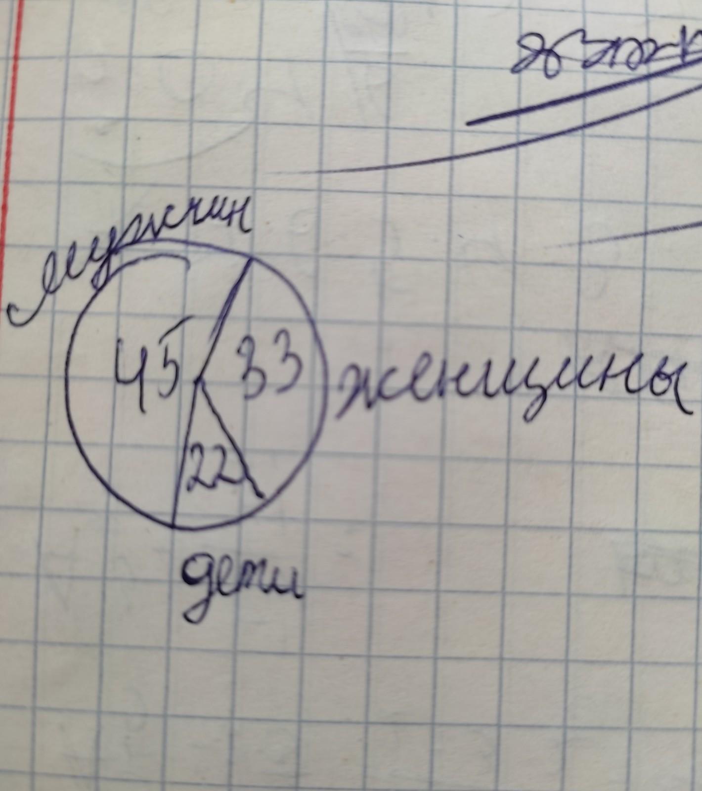 Женщин 33,75% это = 121,5 градуса на круге