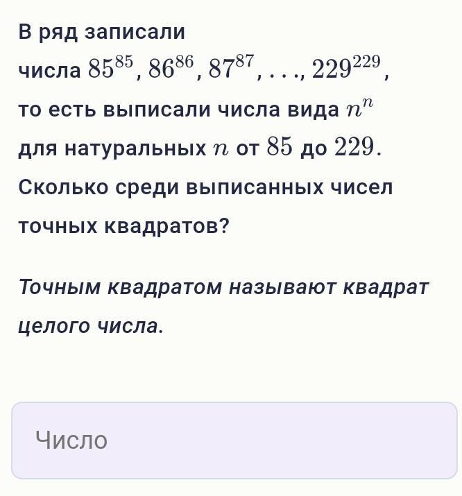 В ряд записали числа 85^85, 86^86, 87^87, …, 229^229, то есть выписали числа вида nn для натуральных n от 85 до 229. Сколько среди выписанных чисел точных квадратов?