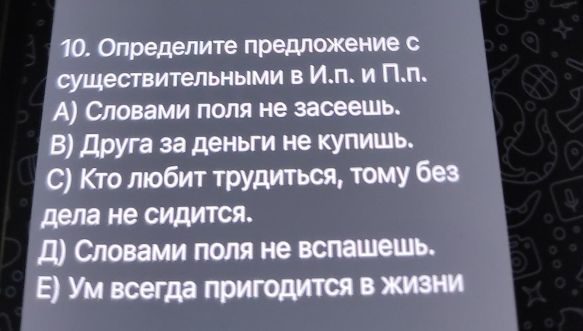 2 nailips 10. Определите предложение с существителЬНЫМИ В И.П. и П.П. А) Словами ПОЛя не засеешь. В) Друга за деньги не купишь. C) Кто любит трудиться, тому без дела нe cИДИТСЯ. Д) Словами ПОЛя не вспашешь. E) Ум всегда приГОДИТСЯ В ЖИЗНИ Я bou