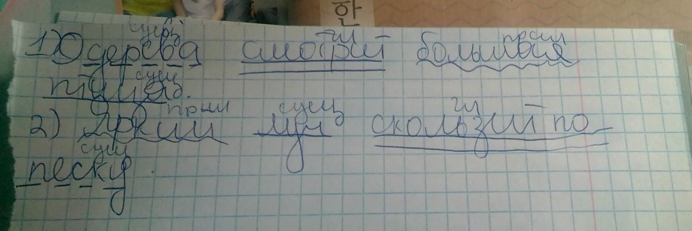 2. Синтаксический разбор предложения. 1.С дерева на нас смотрит большая птица. 2.Яркий луч скользит по песку.