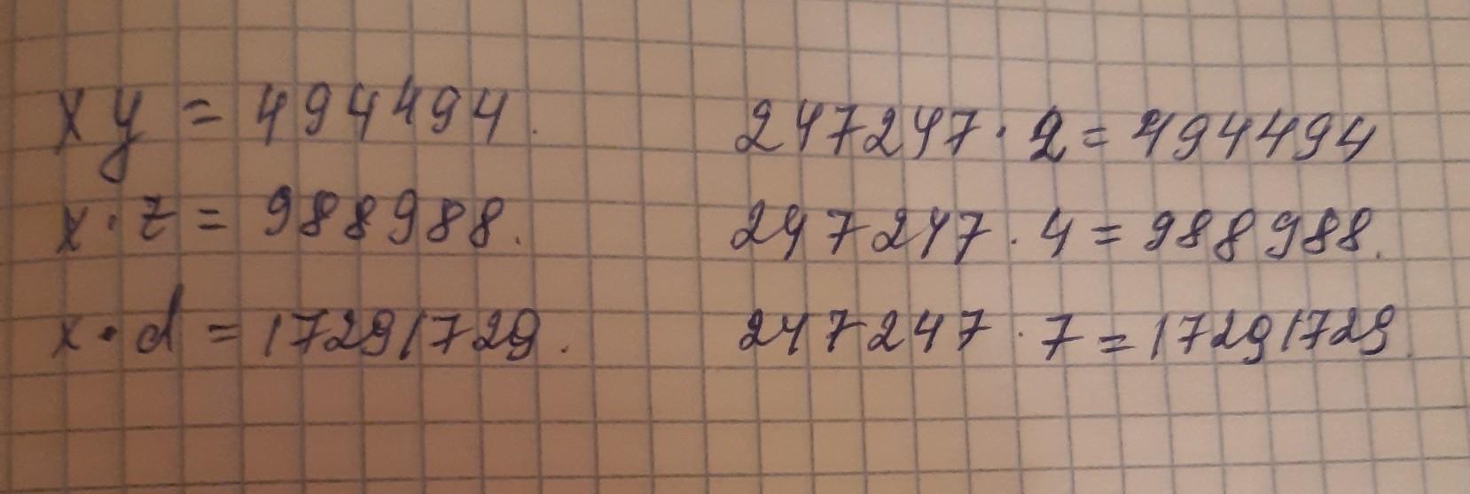 Число умножили на первую цифру и получили 494494, на вторую —— 988988, на третью —— 17291729. Найдите это число. 20 баллов