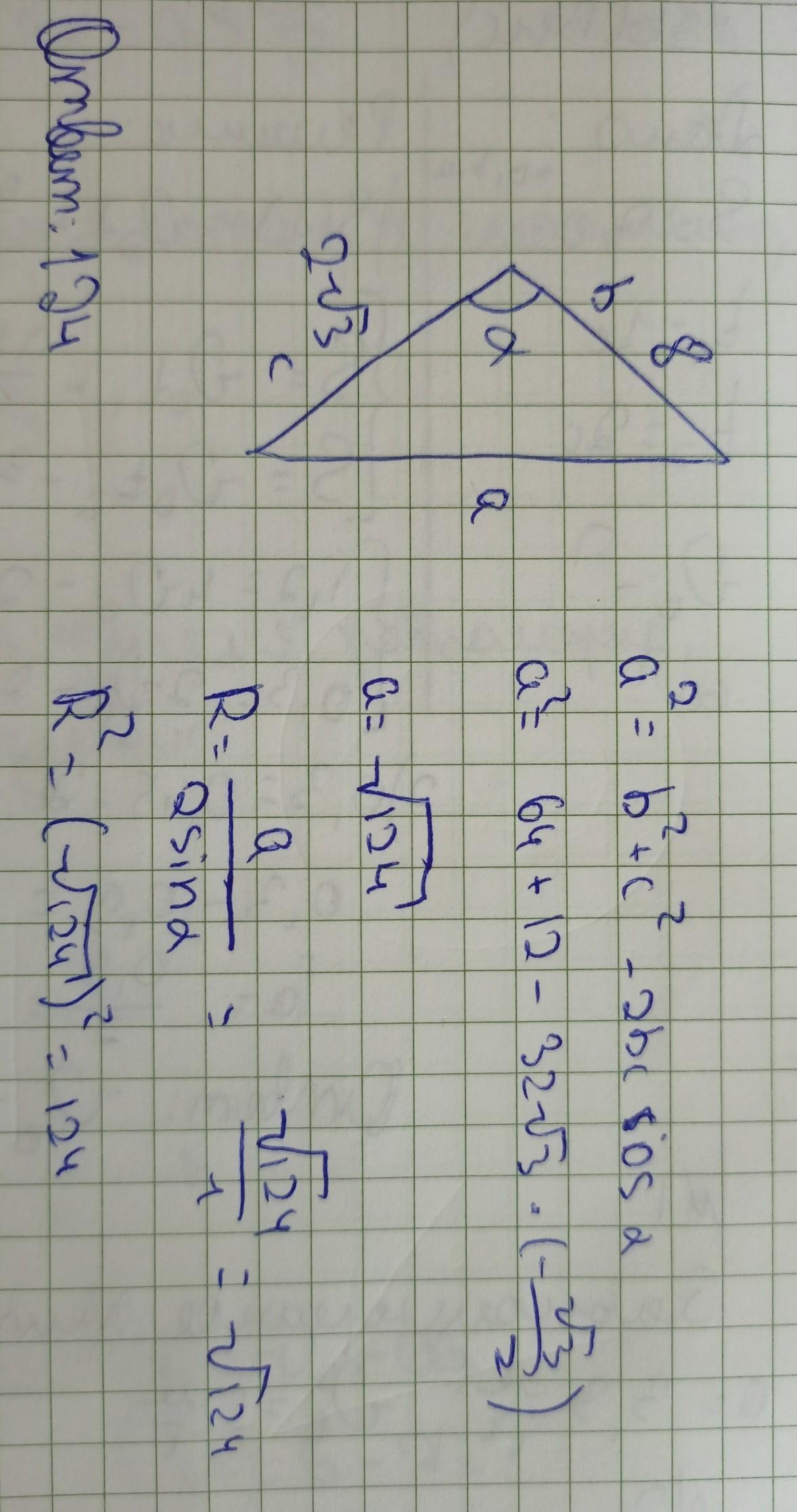 Для треугольника ABC известно следующее: AB=2√3, BC=8, ∠ABC=150∘. Найдите R^2, где R — радиус наименьшего круга, в который можно поместить этот треугольник. Срочно помогите, пожалуйста!!!