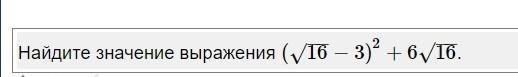 {( \sqrt{16} - 3) }^{2}  + 6 \sqrt{16}   =  \\ =  { \sqrt{16} }^{2}  - 2 \times 3 \times  \sqrt{16}  +  {( - 3)}^{2}  + 6 \sqrt{16}  =  \\  = 16 - 6 \sqrt{16}  + 9  + 6 \sqrt{16}  = 25