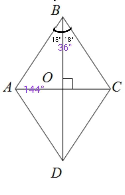 1) По свойствам ромба диагональ является биссектрисой его угла, тогда величина острого угла ромба 18° • 2 = 36°. Пусть это будет ∠ В.