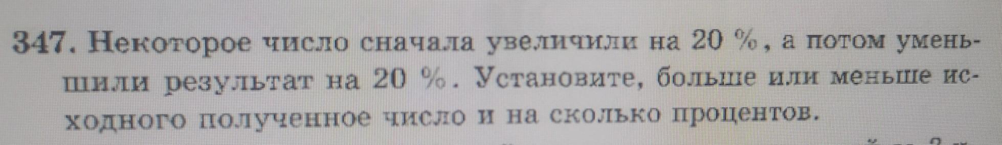 То есть пусть У будет числом 20. 20 + 20% это как 20 : 100 умножить на 120%. Будет 24. Затем убирают 20% снова. 120 - 20 = 100 значит сколлько процентов опять будет у У. А с ровно 100% был унас 20. 24 это 120% а 20 это 100%.