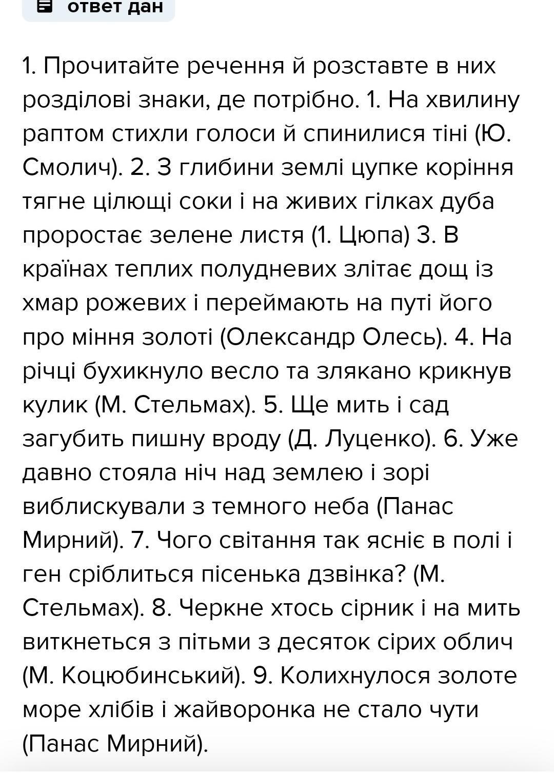1. На хвилину раптом стихли голоси й спинилися тіні. 2. З глибини землі цупке коріння тягне цілющі соки і на живих гілках дуба проростає зелене листя. 3. В країнах теплих, полудневих злітає дощ із хмар рожевих, і переймають на путі його проміння золоті. 4. На річці бухикнуло весло та злякано крикнув кулик. 5. Ще мить — і сад загубить пишну вроду. 6. Уже давно стояла ніч над землею, і зорі виблискували з темного неба. 7. Чого світання так яснім в полі і ген сріблиться пісенька дзвінка? 8. Черкне хтось сірник — і на мить виткнеться з пітьми з десяток сірих облич. 9. Колихнулося золоте море хлібів, і жайворонка не стало чути.