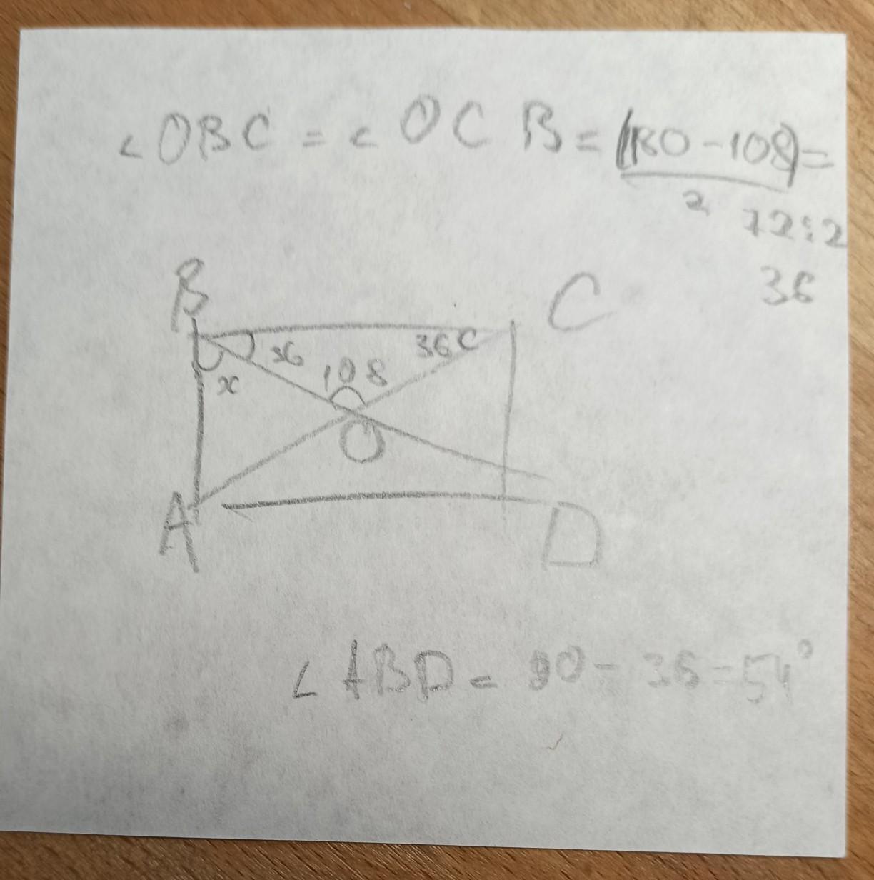 У прямокутнику О точка перетину діагоналі,а кут BOC = 108°.Знайти кут ABD