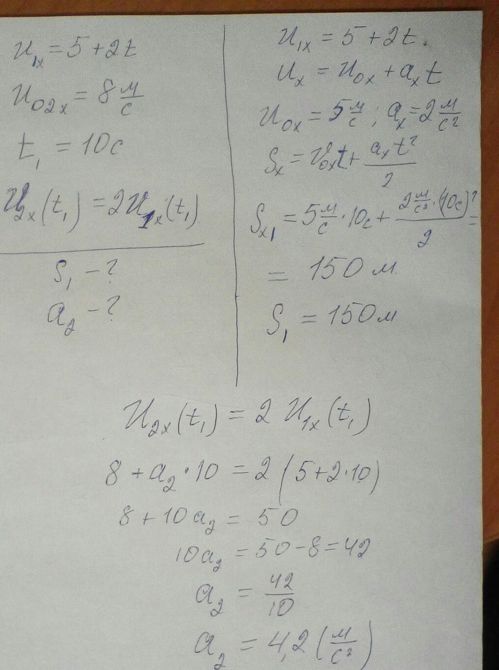 Зависимость проекции скорости от времени для первого автомобиля в единицах СИ выражаешься формулой u1x =5+2t. Проекция начальной скорости второго автомобиля на ось равна 8м/с.