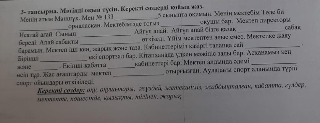 1.Мектепте 2.көшесінде 3.жүздей 4.жетекшіміз 5.тілінен 6.қызықты 7.жабдықталған 8.қабатта 9.оқу 10.гүлдер 11.оқушылары