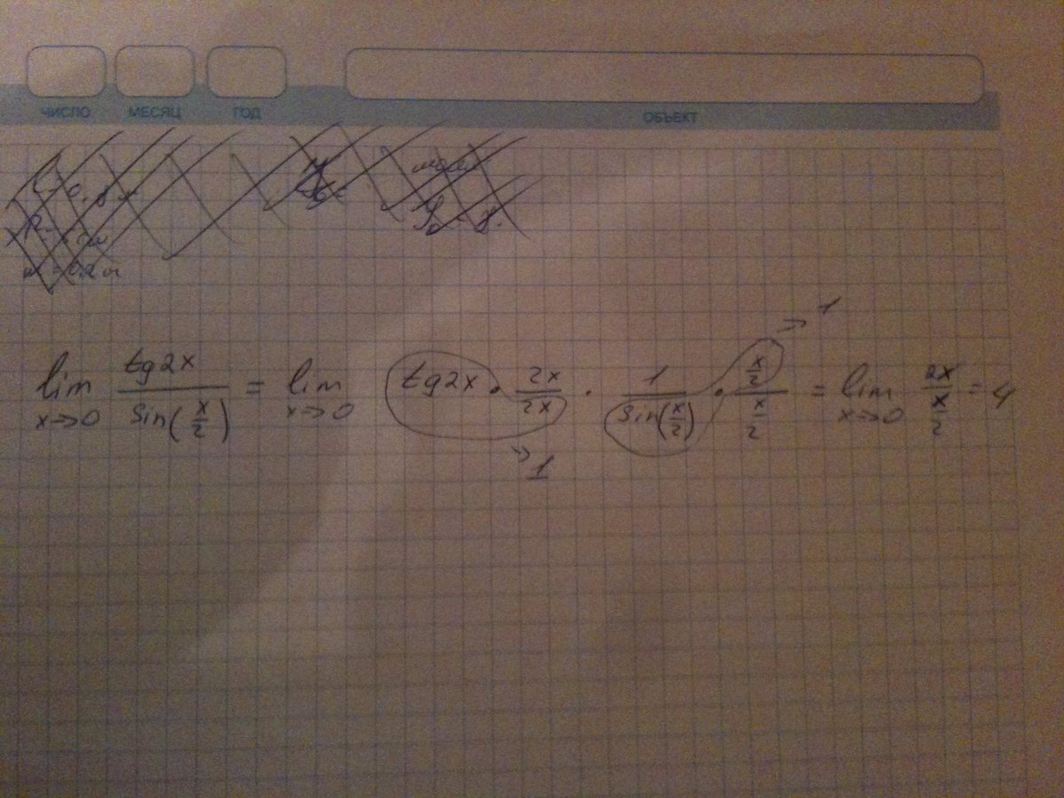 lim(X стемится к О) tg(2x)/sin(x/2) = lim (X стемится к О) tg(2x)*2x/2x * (x/2)/( 1/sin(x/2) * (x/2) ) = lim (X стемится к О) 2x / (x/2) = 4