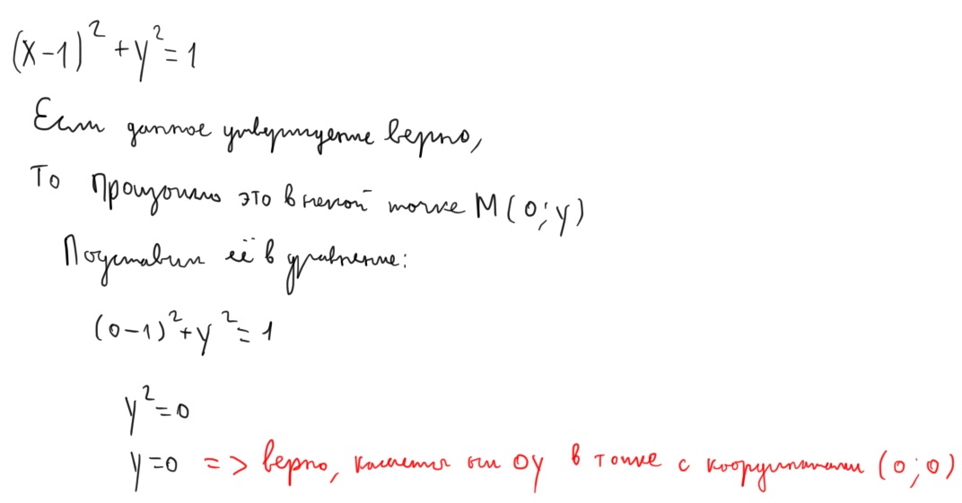 верно но можно проще решить уравнение -окружность ,с центром (1, 0) и радиусом 1 значит левая точка по оси х (0 0) =.>окружность касается оу