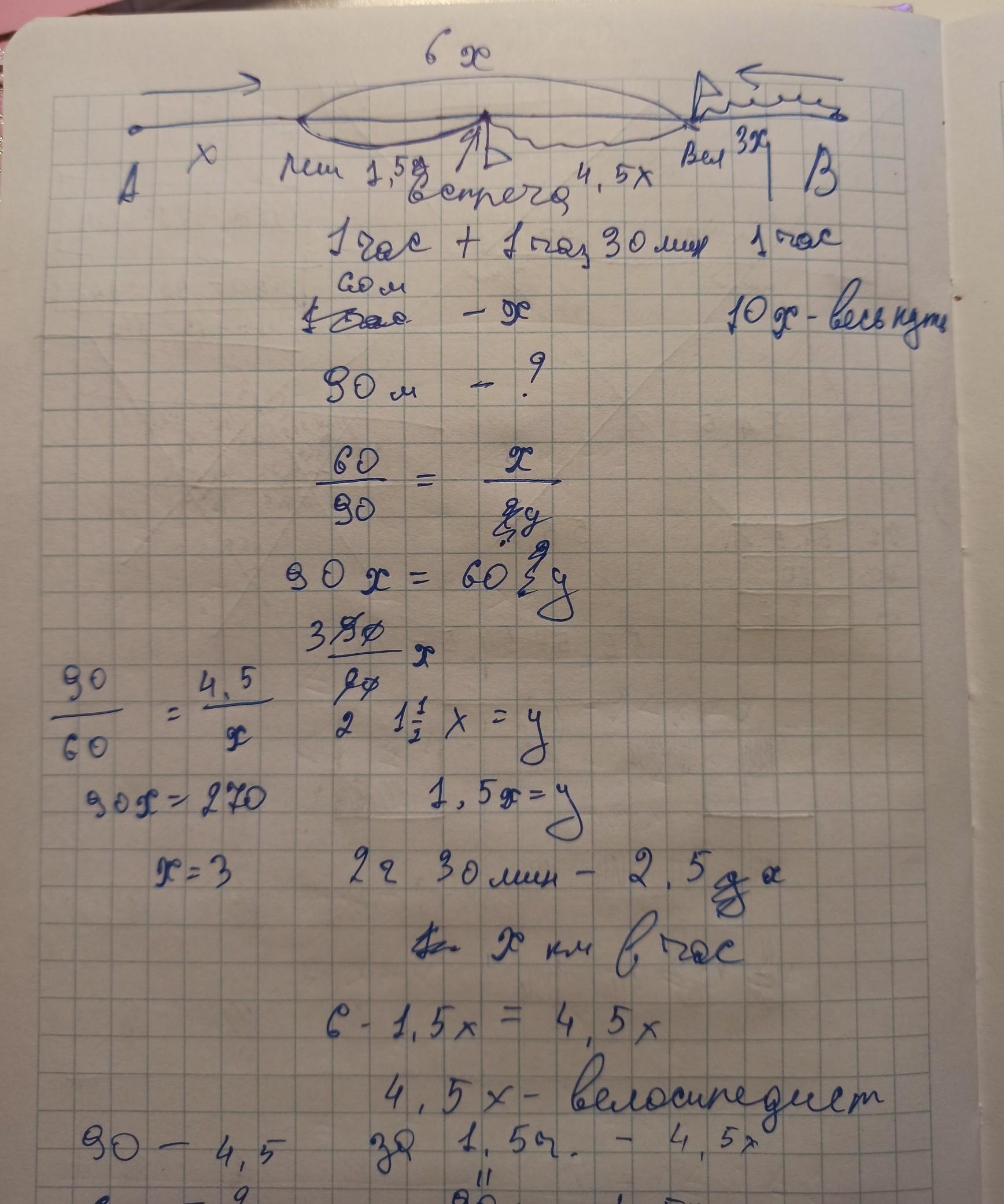 Из пункта A в пункт B вышел пешеход. Одновременно с ним из B в A выехал велосипедист. Через час пешеход находился от велосипедиста в 6 раз дальше, чем от пункта A. Еще через 1 час 30 минут произошла их встреча, после которой оба продолжили путь. Сколько часов занял путь пешехода от A до B?