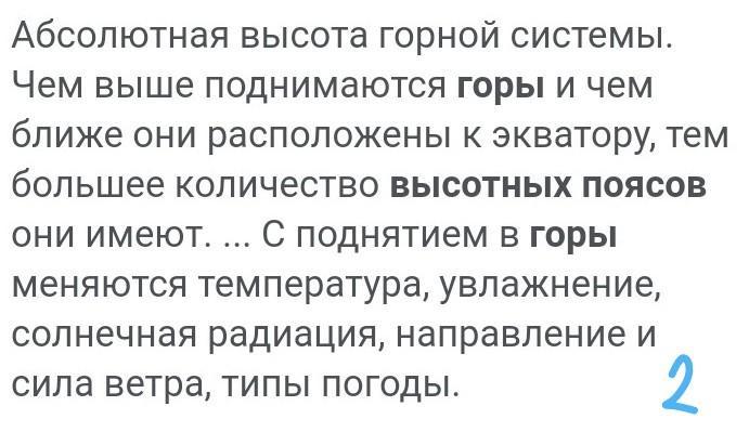 2)Абсолютная высота горной системы. Чем выше поднимаются горы и чем ближе они расположены к экватору, тем большее количество высотных поясов они имеют. ... С поднятием в горы меняются температура, увлажнение, солнечная радиация, направление и сила ветра, типы погоды.