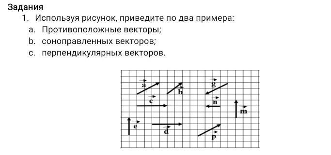 Используя рисунок, приведите по два примера: Противоположные векторы; соноправленных векторов; перпендикулярных векторов.