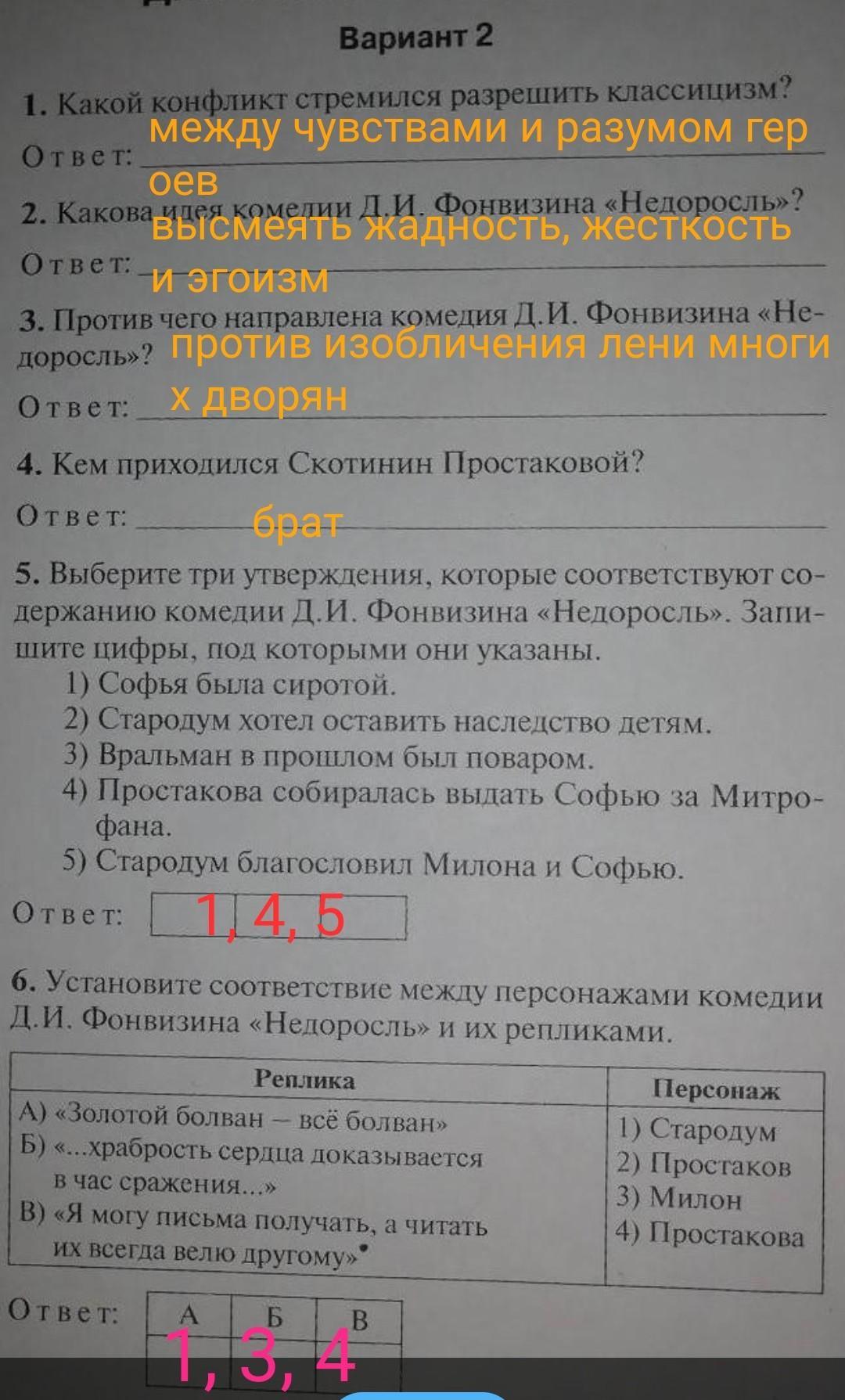 3) Вральман в прошлом был поваром. 4) Простакова собиралась Выдать Софью за Митро- фана.