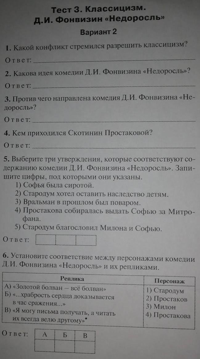 Тест 3. Классицизм. ди. Фонвизин «Недоросль» Вариант 2