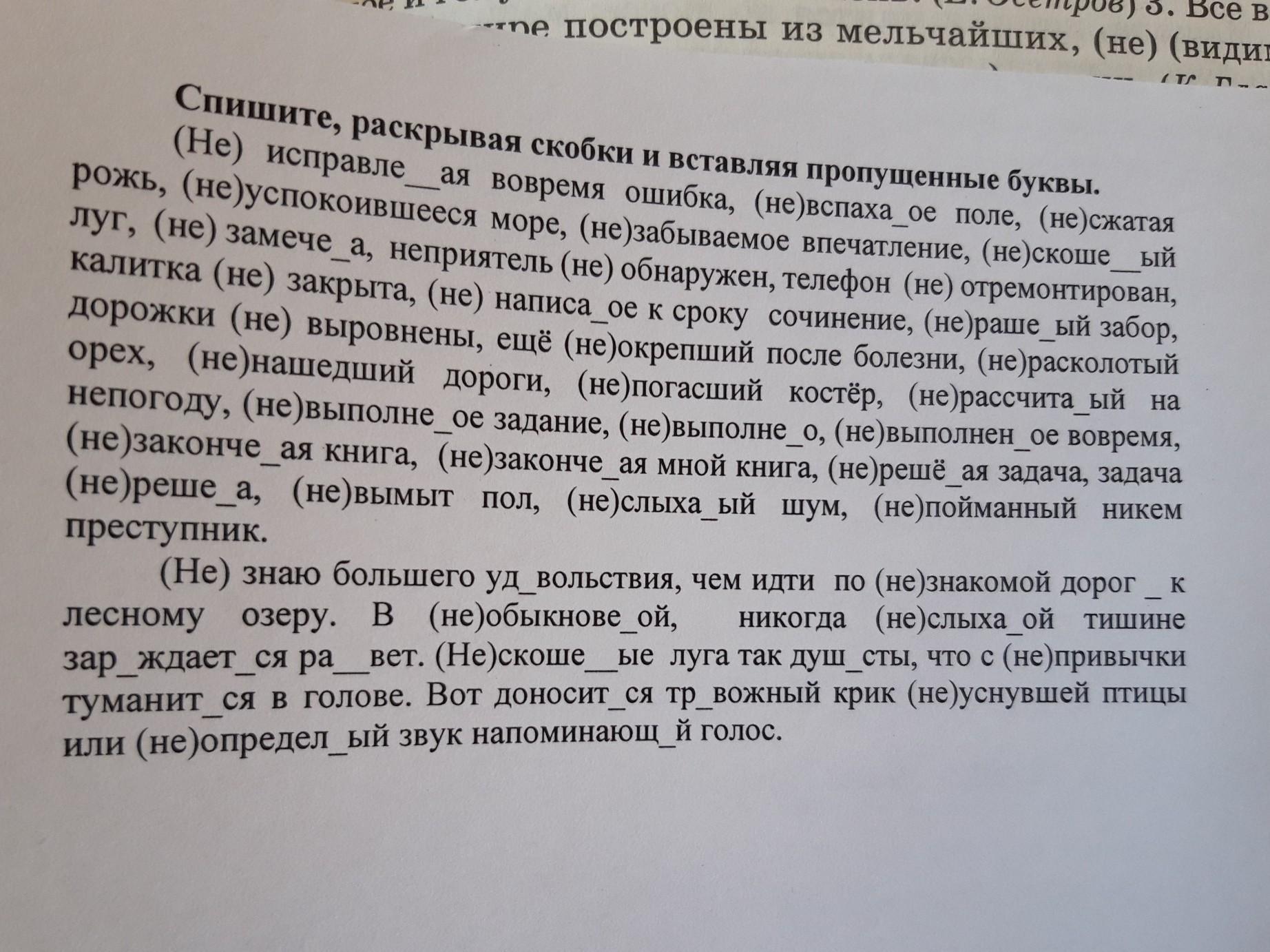 Спишите, раскрывая скобки и вставляя пропущенные буквы. (Не) исправле ая вовремя ошибка, (не)вспаха ое поле, (не)сжатая ( рожь, (не)успокоившееся море, (не)забываемое впечатление, (не)скоше_ый луг, (не) замече а, неприятель (не) обнаружен, телефон (не) отремонтирован, калитка (не) закрыта, (не) написа_ое к сроку сочинение, (не)раше ый забор, дорожки (не) выровнены, ещё (не)окрепший после болезни, (не)расколотый орех, (не)нашедший дороги, (не)погасший костёр, (не)рассчита_ый на непогоду, (не)выполне_ое задание, (не)выполне_о, (не)выполнен_ое вовремя, (не)законче_ая книга, (не)законче ая мной книга, (не)решё_ая задача, задача (не)реше а, (не)вымыт пол, (не)слыха_ый шум, (не)пойманный никем преступник. (Не) знаю большего уд_вольствия, чем идти по (не)знакомой дорог к никогда (не)слыха ой тишине лесному озеру. В (не)обыкнове ой, вет. (Не)скоше ые луга так душ сты, что с (не)привычки туманит_ся в голове. Вот доносит_ся тр_вожный крик (не)уснувшей птицы или (не)определый звук напоминающ_й голос. зарждается ра