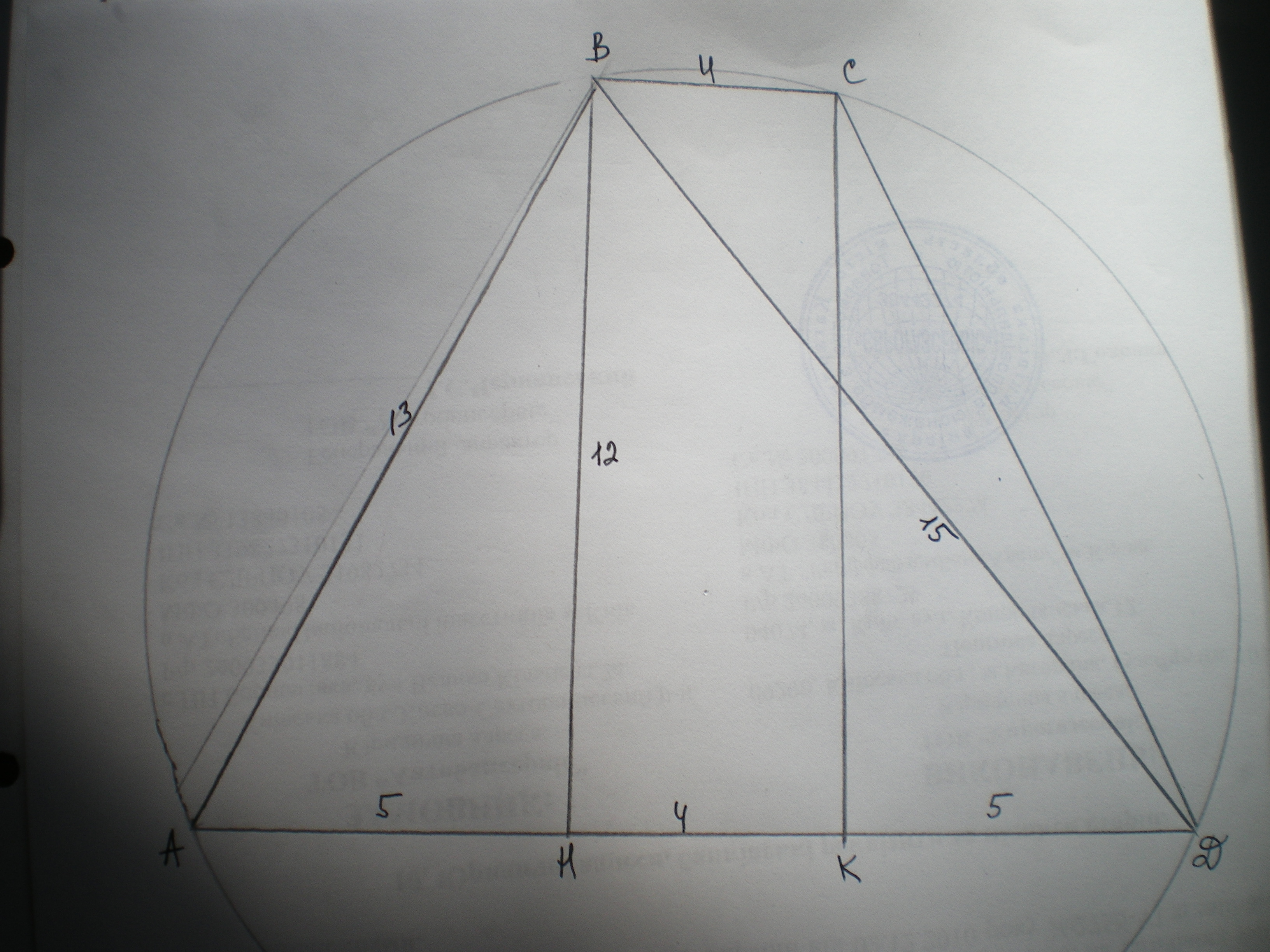 основание трапеции, около которой можно описать окружность, равны 4 см и 14 см, а одна из боковых сторон равна 13 см.найдите длину описаной окружности