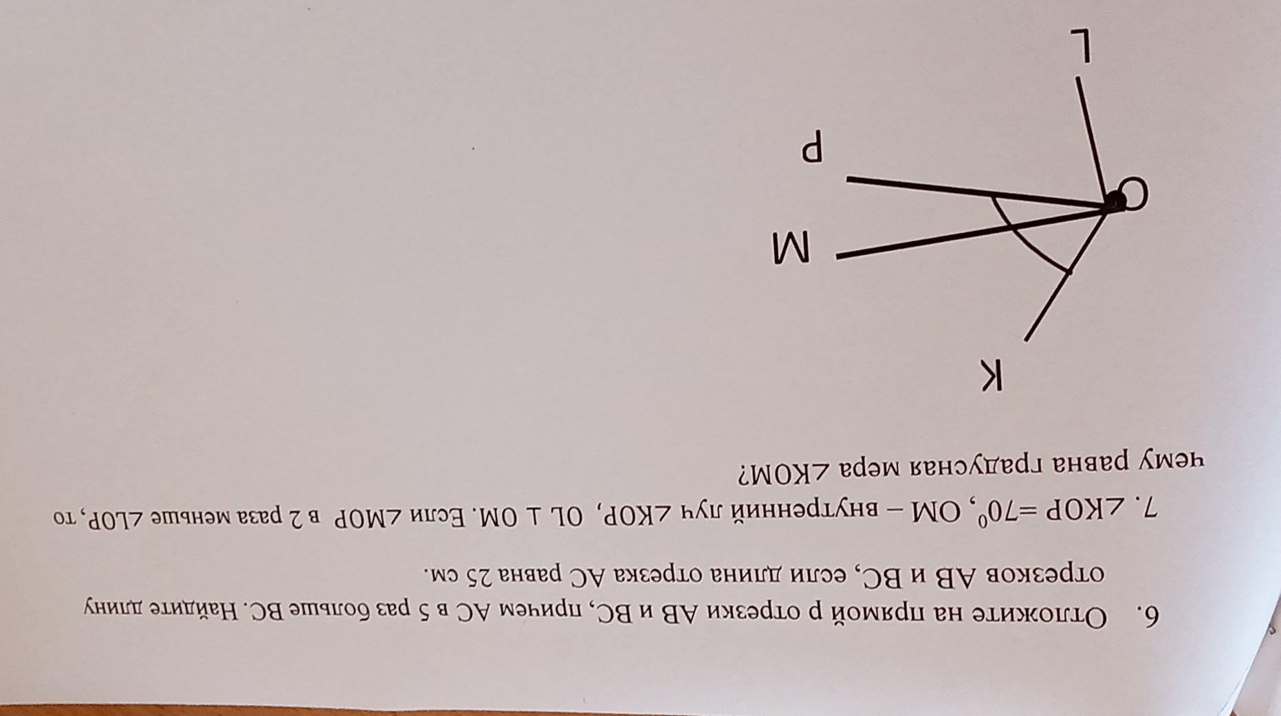 7. KOP=70° по условию сказанно, что угол LOM прямой. Поэтому нужно 90°÷3=30° ( MOP ) 30°×2=60° ( LOP ). Т.к мы уже знаем сколько градусов угол MOP и KOP нужно вычесть 70°-30°=40°