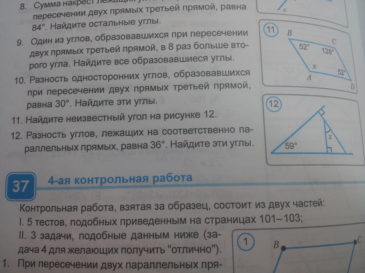 №11 1)180-90-59=31 2)180-90-31=59 градусов- это угол х