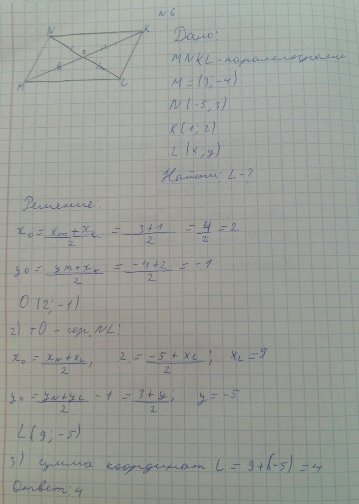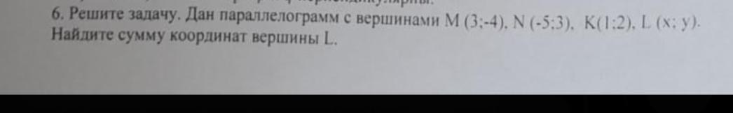 Решите задачу.Дан параллелограмм с вершинами М(3;-4).N (-5;3).K(1;2).L(x;y) найдите сумму координат вершины L