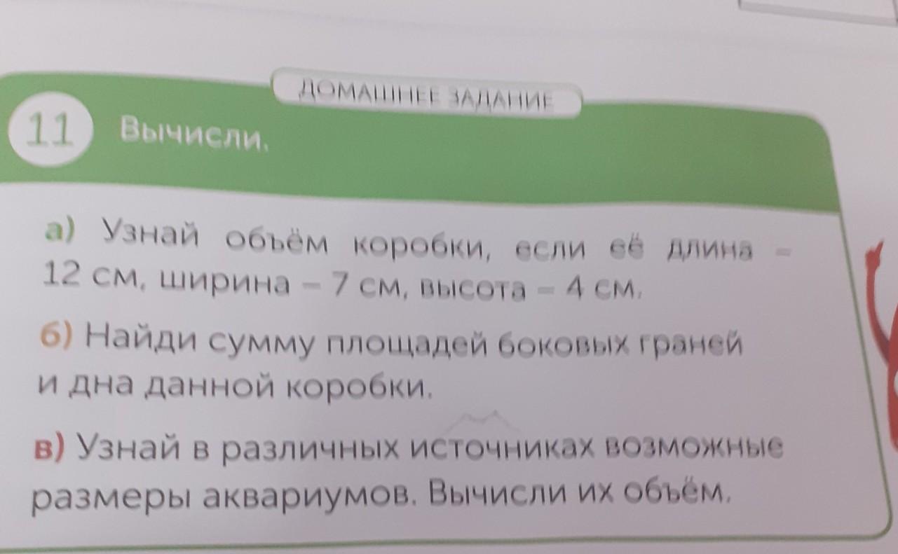 ДОМАШНЕЕ ЗАДАНИЕ 11 Вычисли. а) Узнай объём коробки, если её длина 12 см, ширина - 7 см, высота - 4 см. - 6) Найди сумму площадей боковых граней и дна данной коробки. с