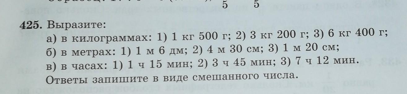 425. Выразите: а) в килограммах: 1) 1 кг 500 г; 2) 3 кг 200 г; 3) 6 кг 400 г; б) в метрах: 1) 1 м 6 дм; 2) 4 м 30 см; 3) 1 м 20 см; в) в часах: 1) 1 ч 15 мин; 2) 3 ч 45 мин; 3) 7 ч 12 мин. Ответы запишите в виде смешанного числа.
