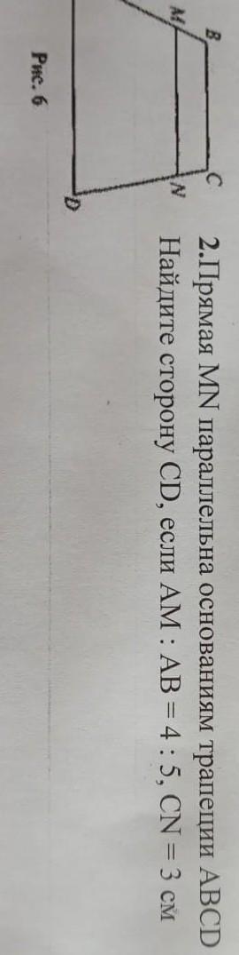 Прямая MN параллельна основаниям трапеции ABCD (рис. 6). n H Найдите сторону CD, если AM: AB = 4: 5, CN = 3 см