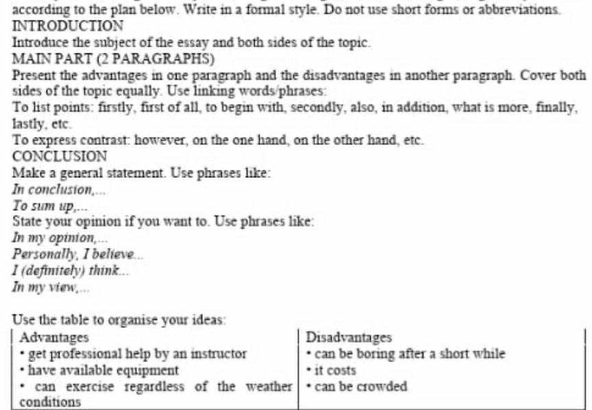 Writing Task 3. Write an essay discussing the advantages and disadvantages of working out at a gym. When you're writing an essay discussing advantages and disadvantages, organise your ideas according to the plan below. Write in a formal style. Do not use short forms or abbreviations. INTRODUCTION Introduce the subject of the essay and both sides of the topic. MAIN PART (2 PARAGRAPHS) Present the advantages in one paragraph and the disadvantages in another paragraph. Cover both sides of the topic equally. Use linking words/phrases: To list points: firstly, first of all, to begin with, addition, what is more, finally, lastly, etc. To express contrast: however, on the one hand, on the other hand, etc. CONCLUSION Make a general statement. Use phrases like: In concluston,. To sum up,.. State your opinion if you want to. Use phrases like: In my opinion,. Personally, I believe. I (definitely) think. In my view,.