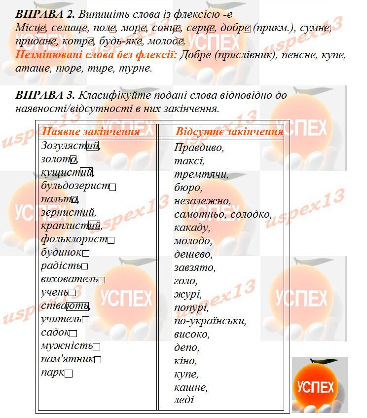 ВПРАВА 2. Випишіть слова із флексією -е Добре (прислівник), місце, селище, пенсне, поле, море, купе, сонце, аташе, серце, пюре, добре (прикм.), сумне, придан, тире, турне, котре, будь-яке, молоде. ВПРАВА 3. Класифікуйте подані слова відповідно до наявності/відсутності в них закінчення. Правдиво, зозулястий, таксі, золото, тремтячи, кущистий, бульдозерист, бюро, незалежно, самотньо, солодко, какаду, пальто, молодо, дешево, зернис- тий, завзято, краплистий, фольклорист, голо, будинок, журі, радість, попурі, по-українськи, високо, вихователь, учень, співають, депо, учитель, кіно, садок, купе, мужність, пам'ятник, кашне, леді, парк