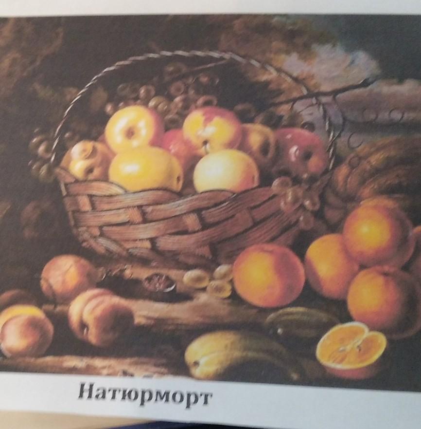 На переднем плане в разброс лежат апельсины, виноград, орехи и всячески разнообразные фрукты. Стал разных оттенков коричневого по всей видимости из за старости или не аккуратного пользования.