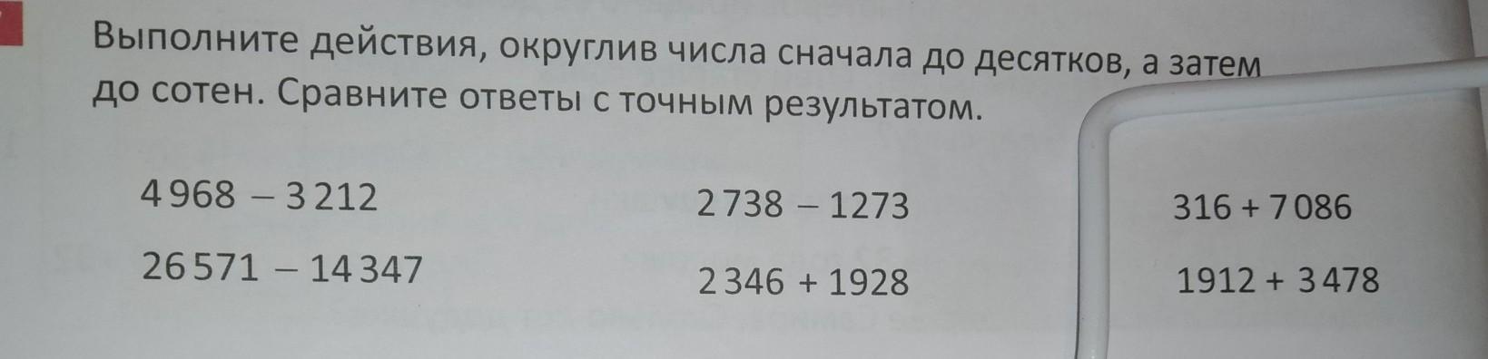 Выполни действия округлите числа сначала до десятков а затем до сотен Сравните ответы с точным результатом помогите пж только пишите примеры а не округляйти сразу