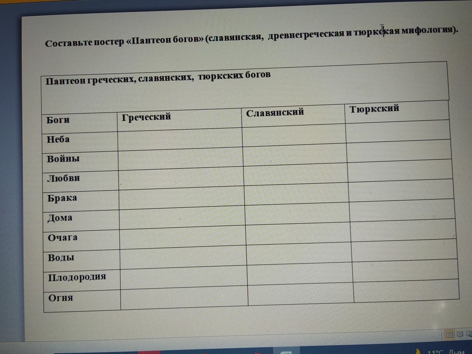 Составьте постер «Пантеон богов» (славянская, древнегреческая и тюркская мифология). Пантеон греческих, славянских, тюркских богов Боги Греческий Славянский Тюркский Неба Войны Любви Брака Дома Очага Воды Плодородия Огня