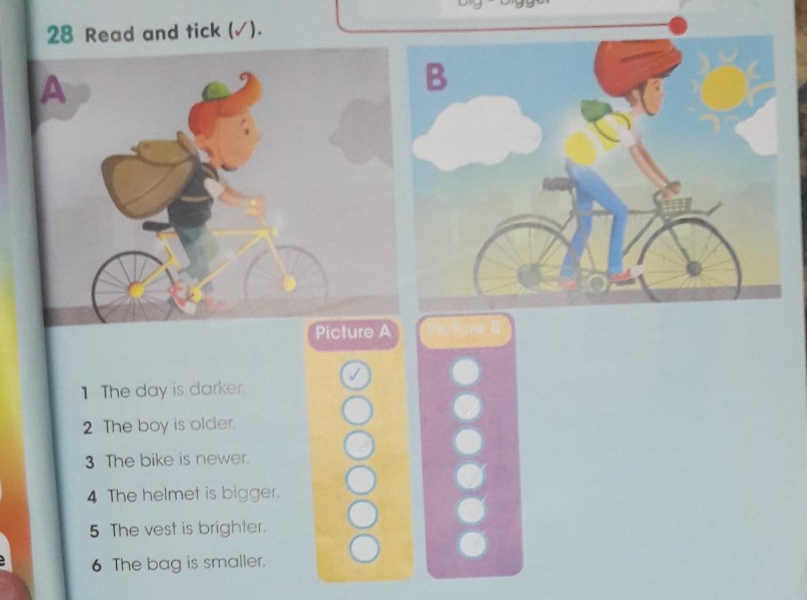 28 Read and tick (). or when B and Picture A Decorate your 1 The Joy is donker 2 The boy is older 3 The bire is newer. 4 The helmets bigger 5 The vest is brighter hen you are our friend. 6 The bog is smaller