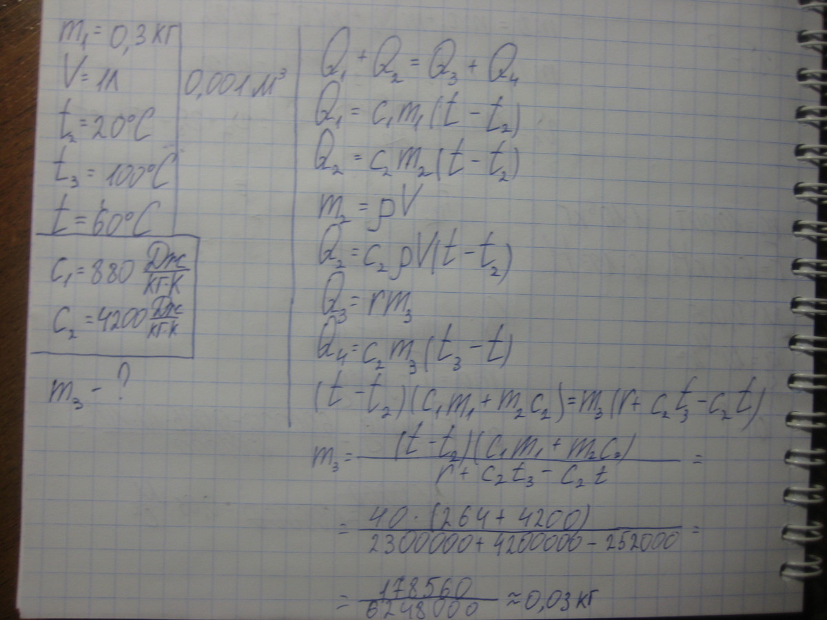 В алюминиевый сосуд массой 300 г, содержащий 1л воды при температуре 20°С, впустили стоградусный пар. Какова масса пара, если в сосуде после его конденсации установилась температура 60°С?