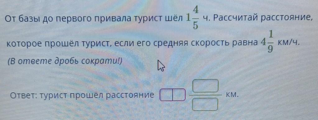 t= 1 4/5 ч = 1.8 ч = 9/5 ч; v= 4 1/9км/ч = 37/9 км/ч
