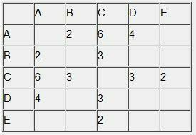 Между населёнными пунктами A, B, C, D, E построены дороги, протяжённость которых (в километрах) приведена в таблице. Определите длину кратчайшего пути между пунктами A и Е. Передвигаться можно только по дорогам, протяжённость которых указана в таблице. *