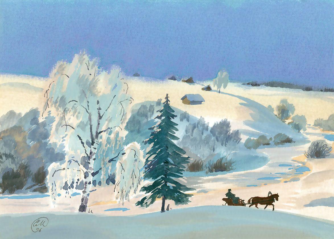 Я слышу на рисунке громкий хруст снега и громкую вьюгу.