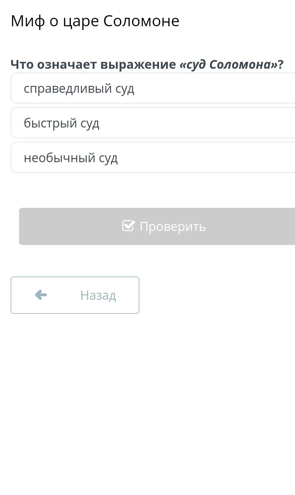 Выражение это употребляется в значении: суд мудрый и скорый. Основано оно на библейском мифе.