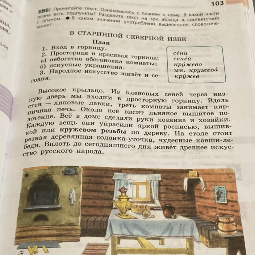 1) Во второй части плана есть подпункты: а) небогатая обстановка комнаты; б) искусные украшения
