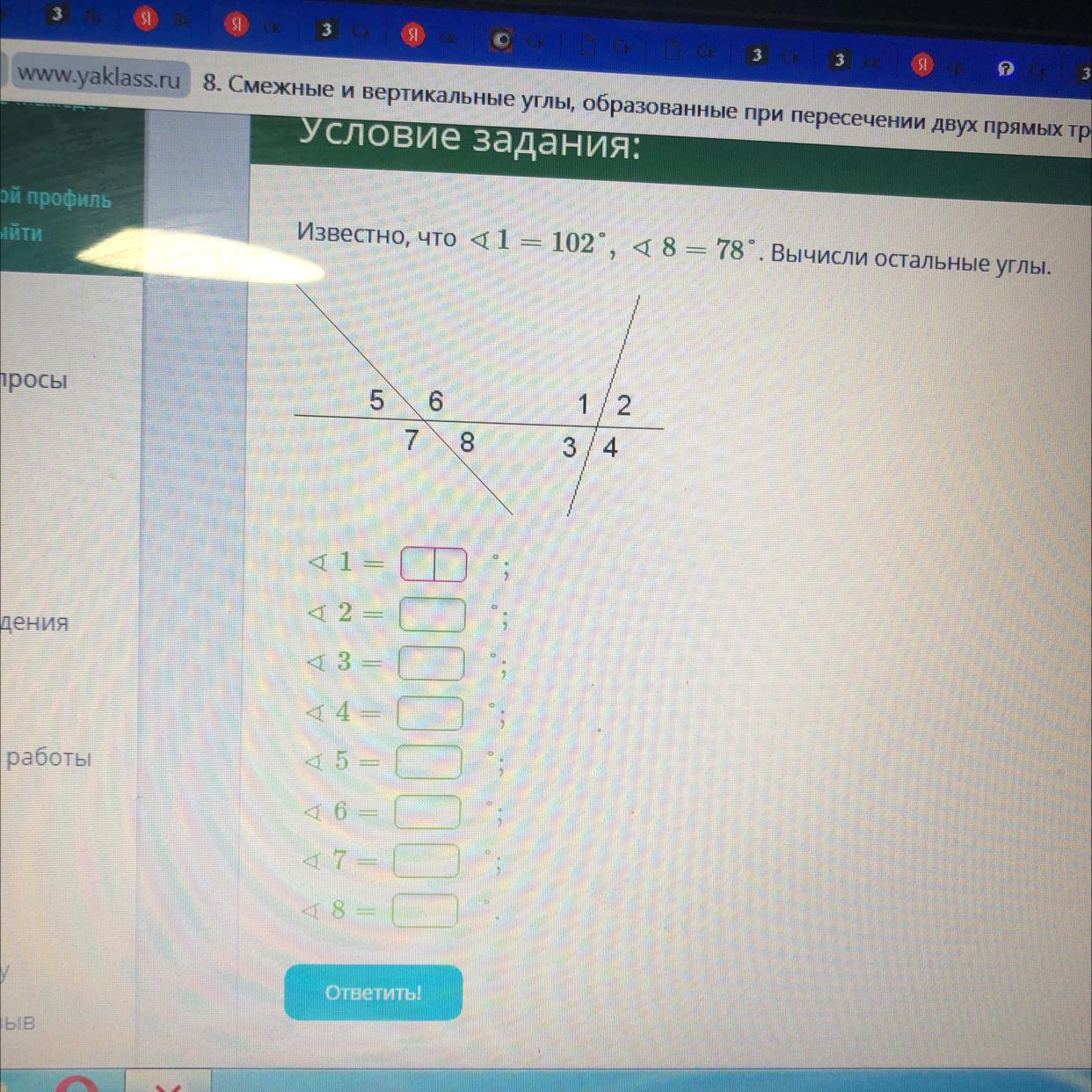 Известно, что <1 = 102, <8 = 78. Вычисли остальные углы.