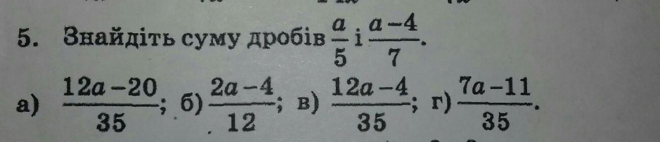 a/5 + ( a - 4 )/7 = ( 7a + 5( a - 4 ) )/35 = ( 7a + 5a - 20 )/35 = ( 12a - 20 )/35 .