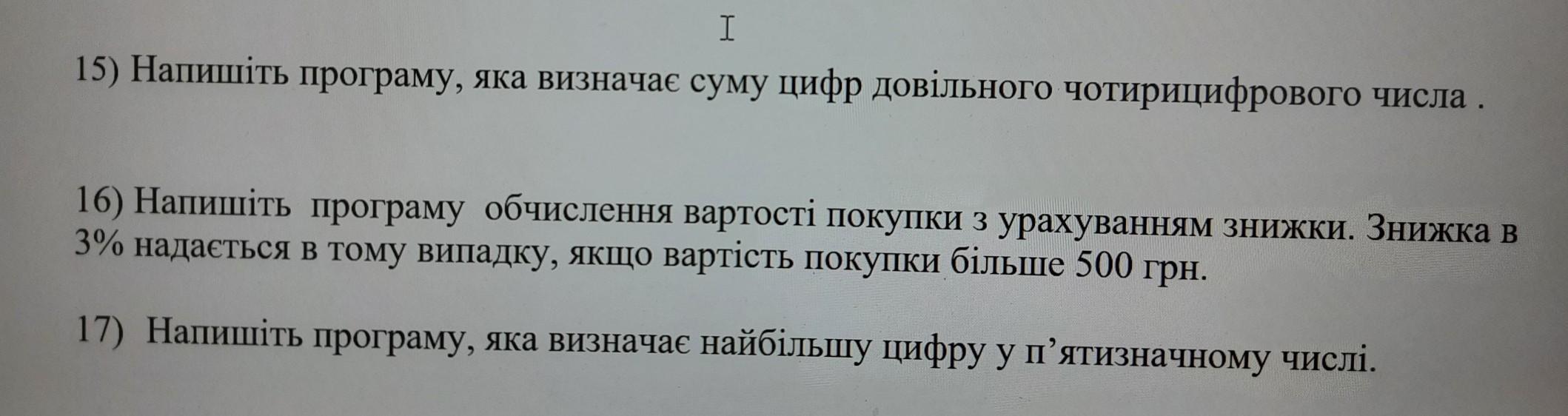 15) Напишите программу, которая определяет сумму цифр произвольного четырехзначных числа 16) Напишите программу вычисления стоимости покупки с учетом скидки. Скидка в 3% предоставляется в том случае, если стоимость покупки больше 500 грн. 17) Напишите программу, которая определяет наибольшую цифру в пятизначном числе.