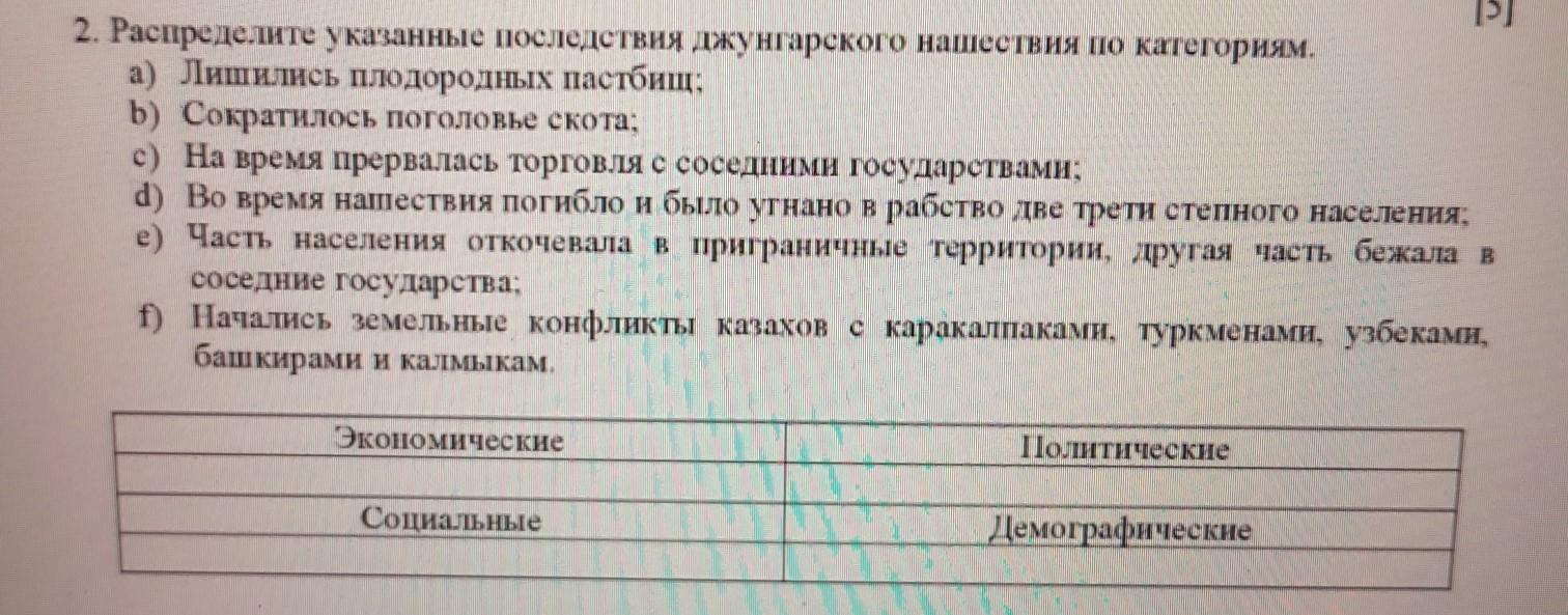 Распределите указанные последствия джунгарского нашествия по категориям.